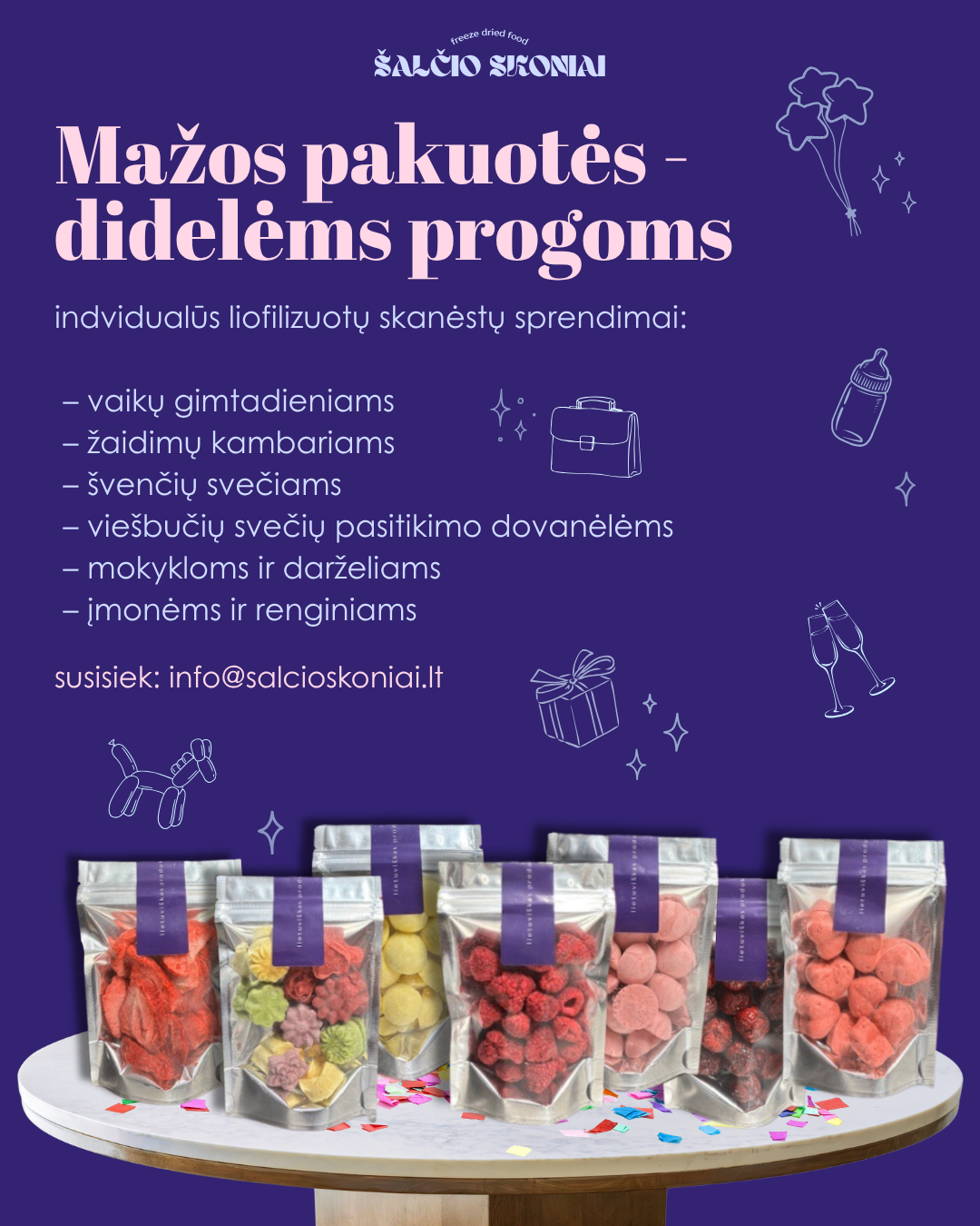 Visus Šalčio Skoniai liofilizuotus produktus gaminame ne tik įprastose pakuotėse – siūlome ir mini versijas, kurias galime pritaikyti Jūsų šventei, verslui ar kitai progai.