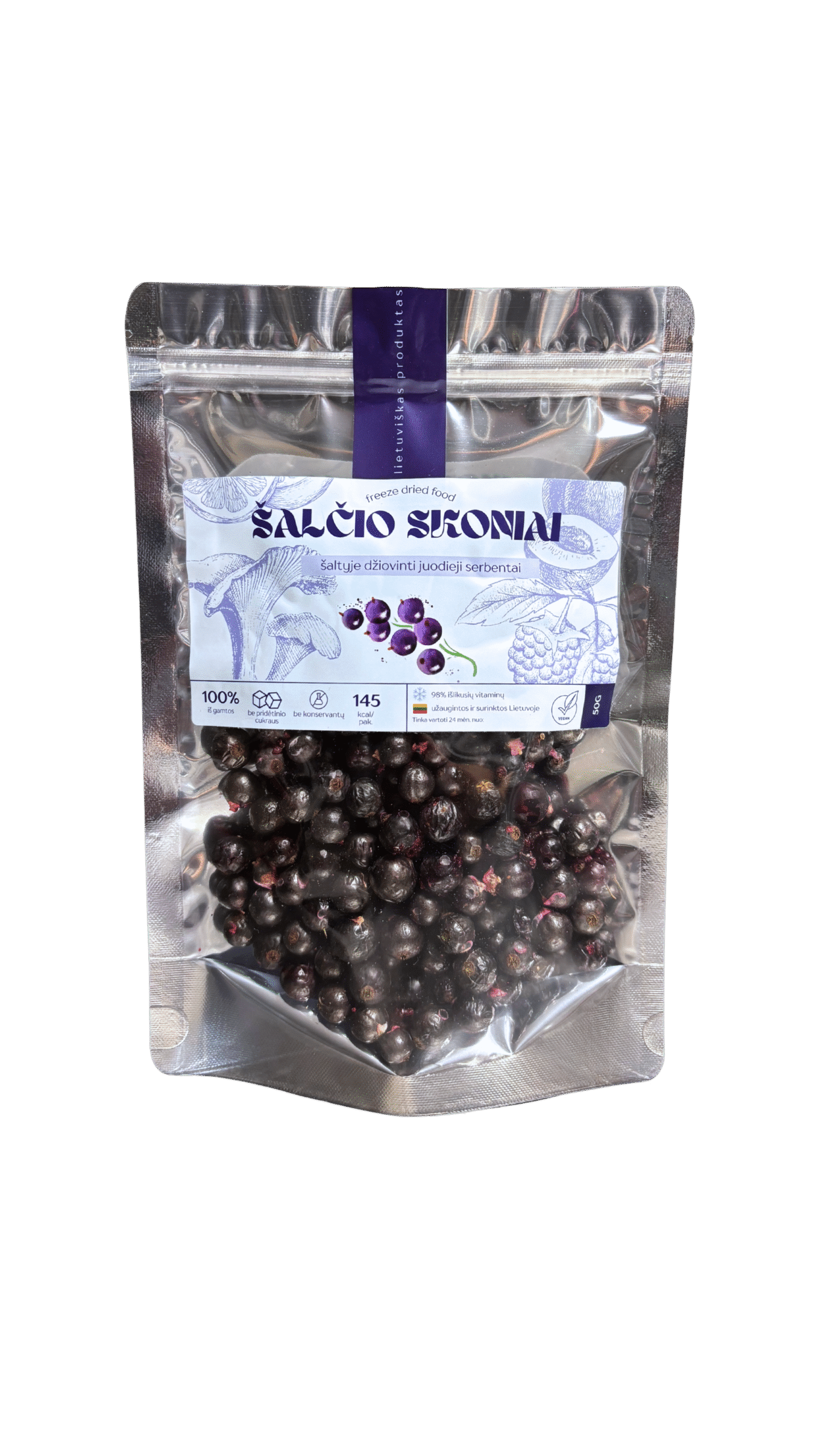 Šalčio Skonių serbentai – lietuviški, surenkami vietiniame ūkyje, o tada kruopščiai atrenkami ir apdorojami rankomis. Liofilizuoti juodieji serbentai pasižymi ryškiu, gaiviu skoniu, kuris puikiai tinka ne tik kasdieniam užkandžiavimui, tačiau ir patiekalų gardinimui: salotoms, padažams, vaisiniams kokteiliams ar pusryčių maistui. Džiovinimo šalčiu metu išsaugomi visi mineralai ir vitaminai, bei intensyvus aromatas. Juodieji serbentai yra puikus pasirinkimas tiems, kurie nori į savo mitybą įtraukti daugiau vitaminų ir atrasti alternatyvą saldumynams. Atraskite šias močiutės sodą primenančias uogas naujame, moderniame formate!