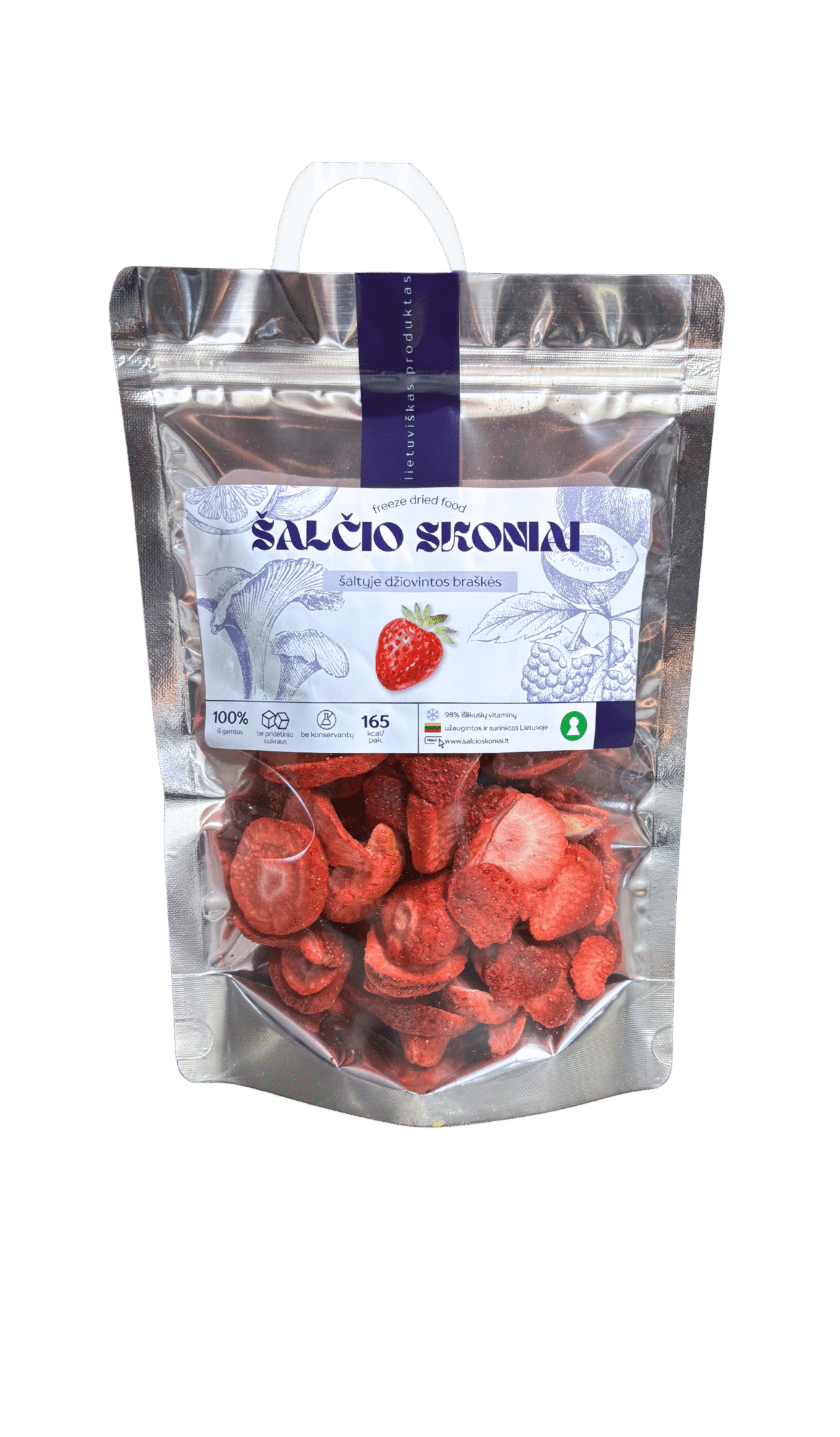 Liofilizuotos braškės – tai natūralus ir sveikas užkandis, kuriame išsaugotas sodrus ir saldus lietuviškų braškių skonis bei maistinės savybės. Džiovinamos šaltyje, jos nepraranda vitaminų, mineralų ir antioksidantų, bei išlaiko tokį patį ryškų skonį, todėl yra puikus sveikas pasirinkimas ištisus metus.