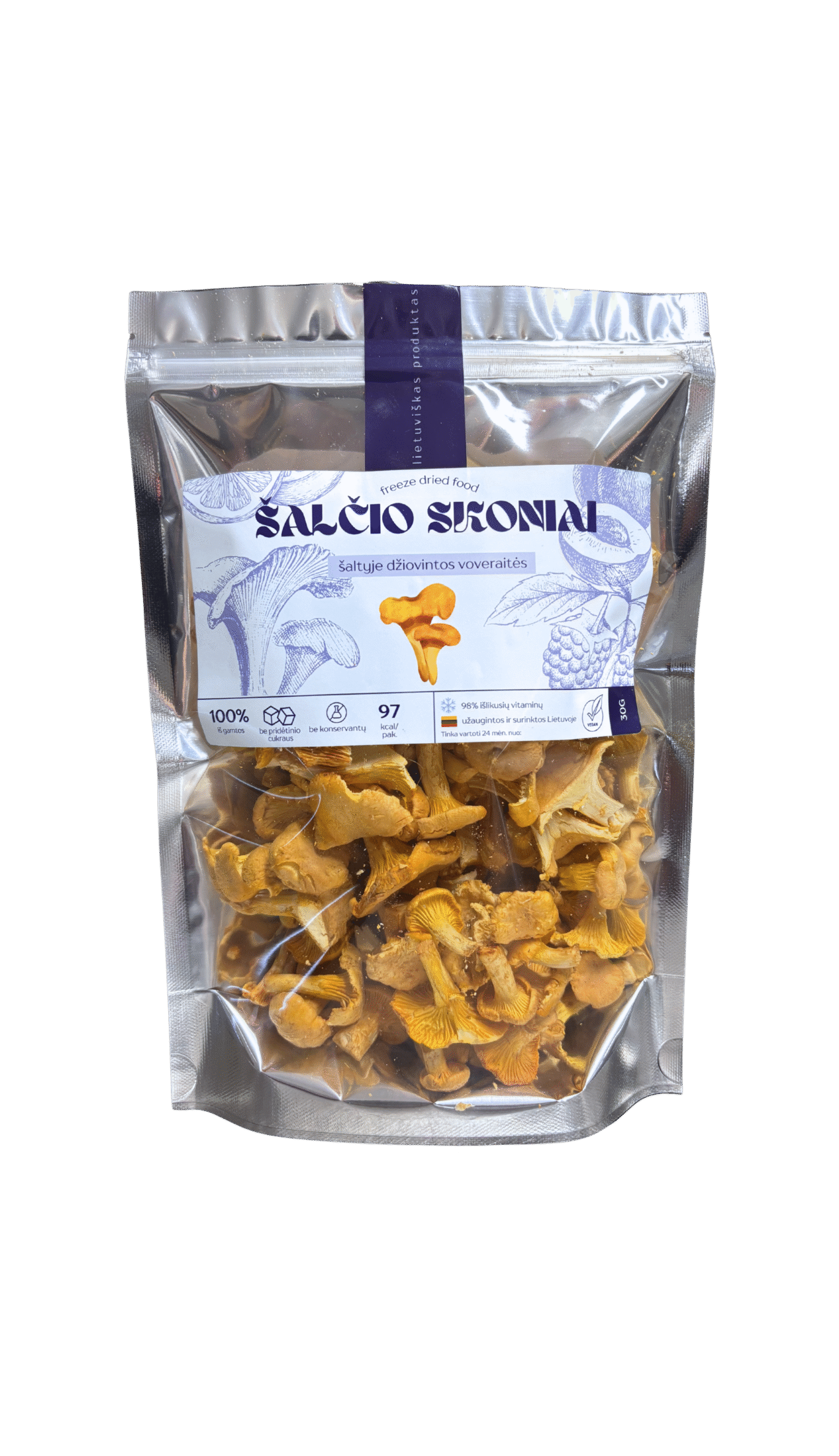 Liofilizavimui naudojamos tik aukščiausios kokybės, kruopščiai atrinktos voveraitės, kurios po džiovinimo šaltyje išlaiko savo autentišką, ryškų skonį ir aromatą. Liofilizacijos procesas leidžia išsaugoti visas vertingas grybų medžiagas ir užtikrina ilgą vartojimo laiką. Tai naujas, patogus ir modernus būdas mėgautis voveraitėmis visus metus – be kompromisų skoniui ar kokybei. Idealiai tinka gardinant sriubas, troškinius, padažus ar kitoms gurmaniškoms improvizacijoms virtuvėje. Tiesiog įdėkite voveraičių į gaminamą patiekalą – sušlapusios jos akimirksniu grįžtą į šviežią formatą, lyg ką tik iš miško.